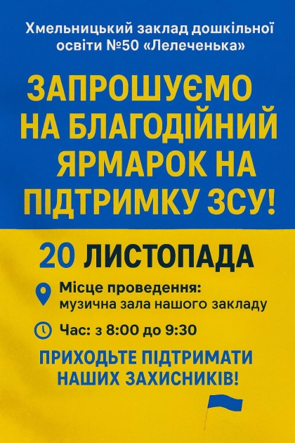 Хмельницький ЗДО №50 «Лелеченька» з великим трепетом і любов’ю запрошує вас на БЛАГОДІЙНИЙ ЯРМАРОК на підтримку Збройних Сил України!